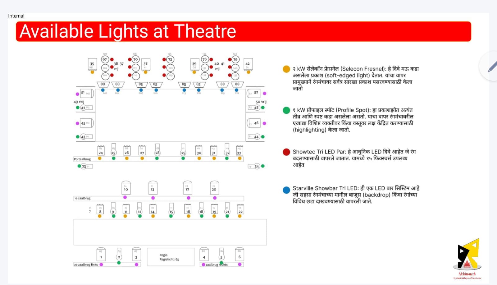 प्रकाश आणि ध्वनी यासाठी थिएटरकडून तंत्रज्ञ उपलब्ध करून दिला जाईल, मात्र, संचालन तसेच त्यांच्याशी संवाद व समन्वय साधण्यासाठी तुमचा स्वतःचा प्रकाश आणि ध्वनी तंत्रज्ञ असणे आवश्यक आहे.
